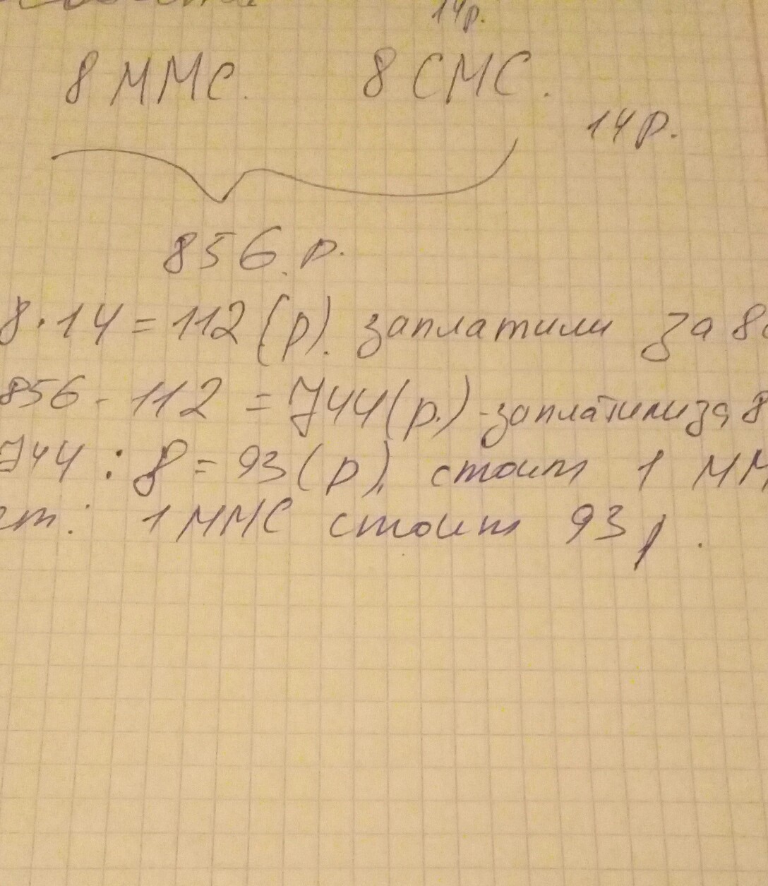 Реши задачу двумя способами. за 8 мультимедийных сообщений в роуминге и столько же текстовых сообщений заплатили 856 руб.Сколько стоит мультимедийное сообщение в роуминге если текстовое сообщение стоит 14 руб. Первым способом я решила. См. фото. Помогите со вторым способом