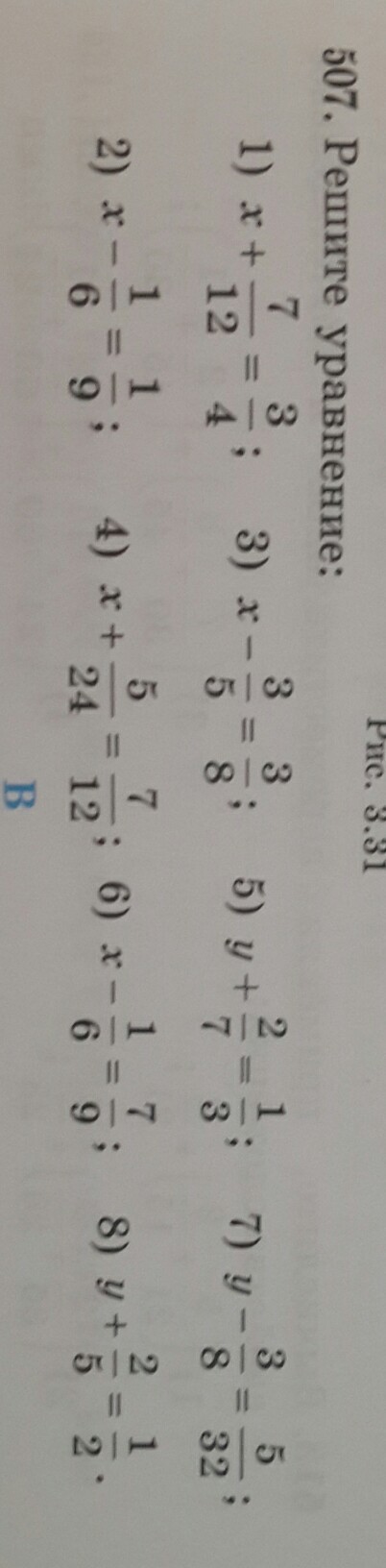 решите уравнение: 1 ) x+ 7/12 = 3/4. 2) x- 1/6 = 1/9. 3) x- 3/5=3/8. 4) x+5/24 = 7/24. 5) y+2/7 =1/3. 6) x-1/6 =7/9. 7) y - 3/8 =5/32. 8) y+ 2/5 =1/2