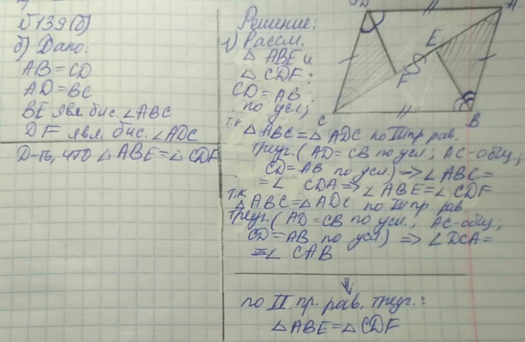 на рисунке 76 AB=CD,AD=BC,BE-биссектриса угла ABC,а DF-биссектриса угла ADC.Докажите что