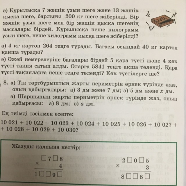 Тіктөртбұрыштың жарты периметрі; а)3+7=10дм ә)5+х(дм)