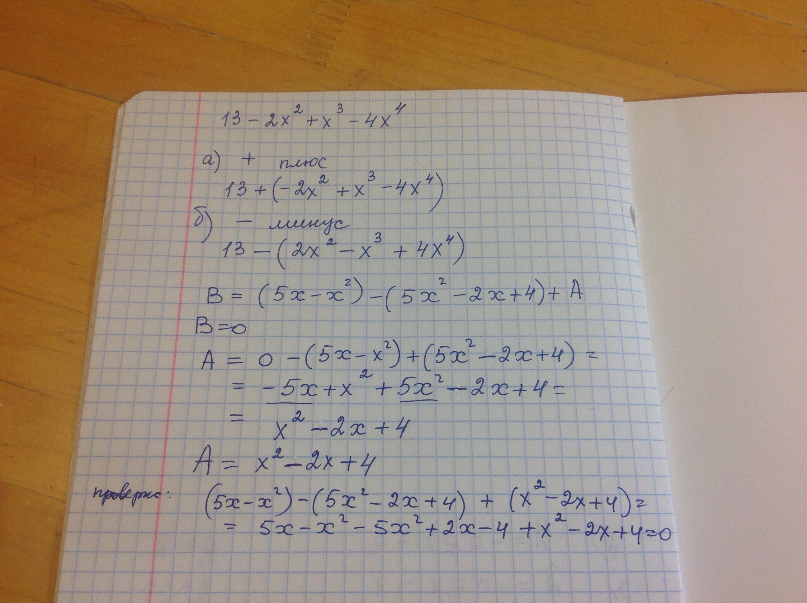 три последних члена многочлена 13 - 2x² + x³ - 4x⁴ заключите в скобки ,перед которыми стоит знак : а )плюс ;б) минус .