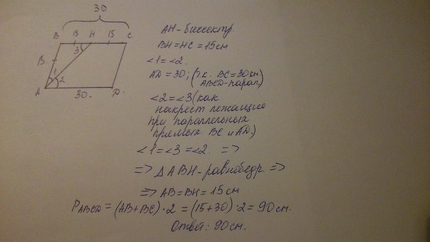 биссектриса одного из углов параллелограмма точкой пересечения делит сторону на два равных отрезка длиной 15 см,найти периметр паралеллограмма