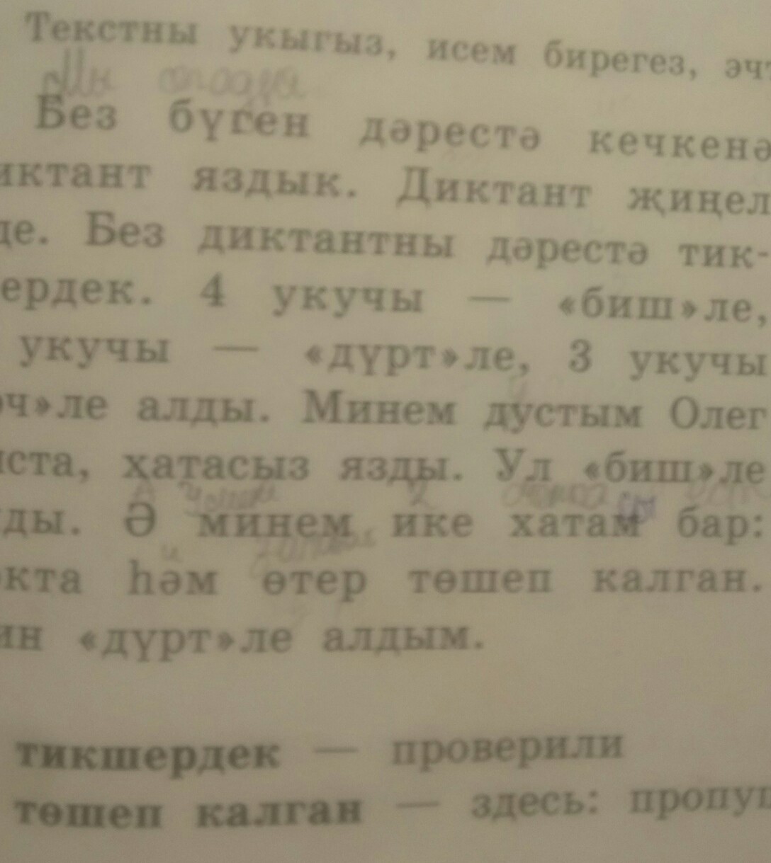 Мы сегодня на уроке писали маленький диктант. Диктант был легким. Мы диктант проверили. Четыре ученика - пятерку, два - четверку, три - тройку получили. Мой друг Олег чисто, без ошибок написал. Он пятерку получил. А у меня две ошибки: точку и запятую забыл поставить. Я четверку получил.