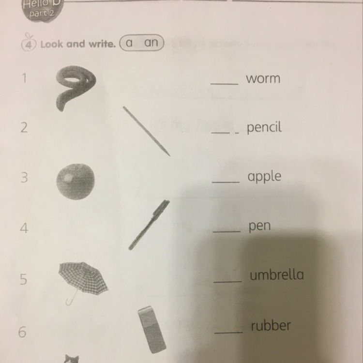 A worm, a pencil, an apple, a pen, an umbrella, a rubber. Тааадам