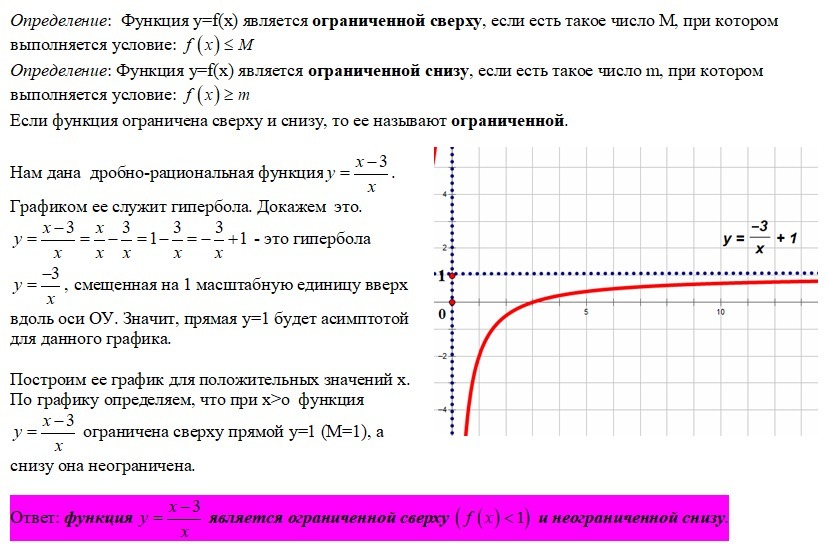 Исследуйте функцию y=(x-3)/x, где x>0 на ограниченность.