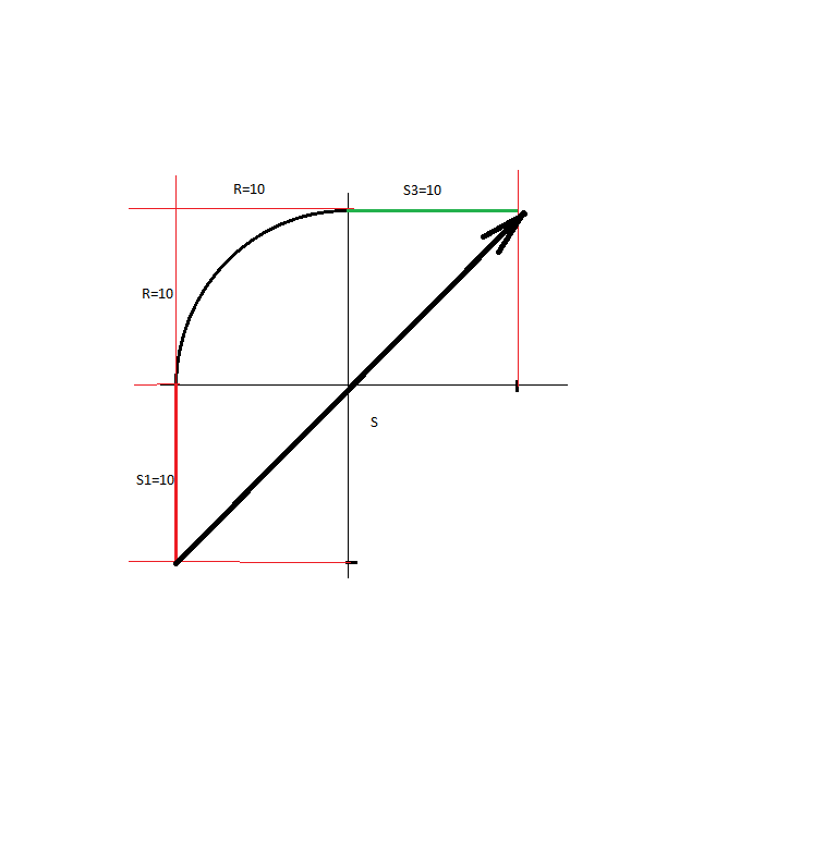 Автомобиль, двигаясь, прямолинейно, проехал путь 10 м, затем сделал поворот, описав четверть окружности радиусом 10 м, и проехал далее по перпендикулярной улице еще 10 м. Определите модуль перемещения автомобиля