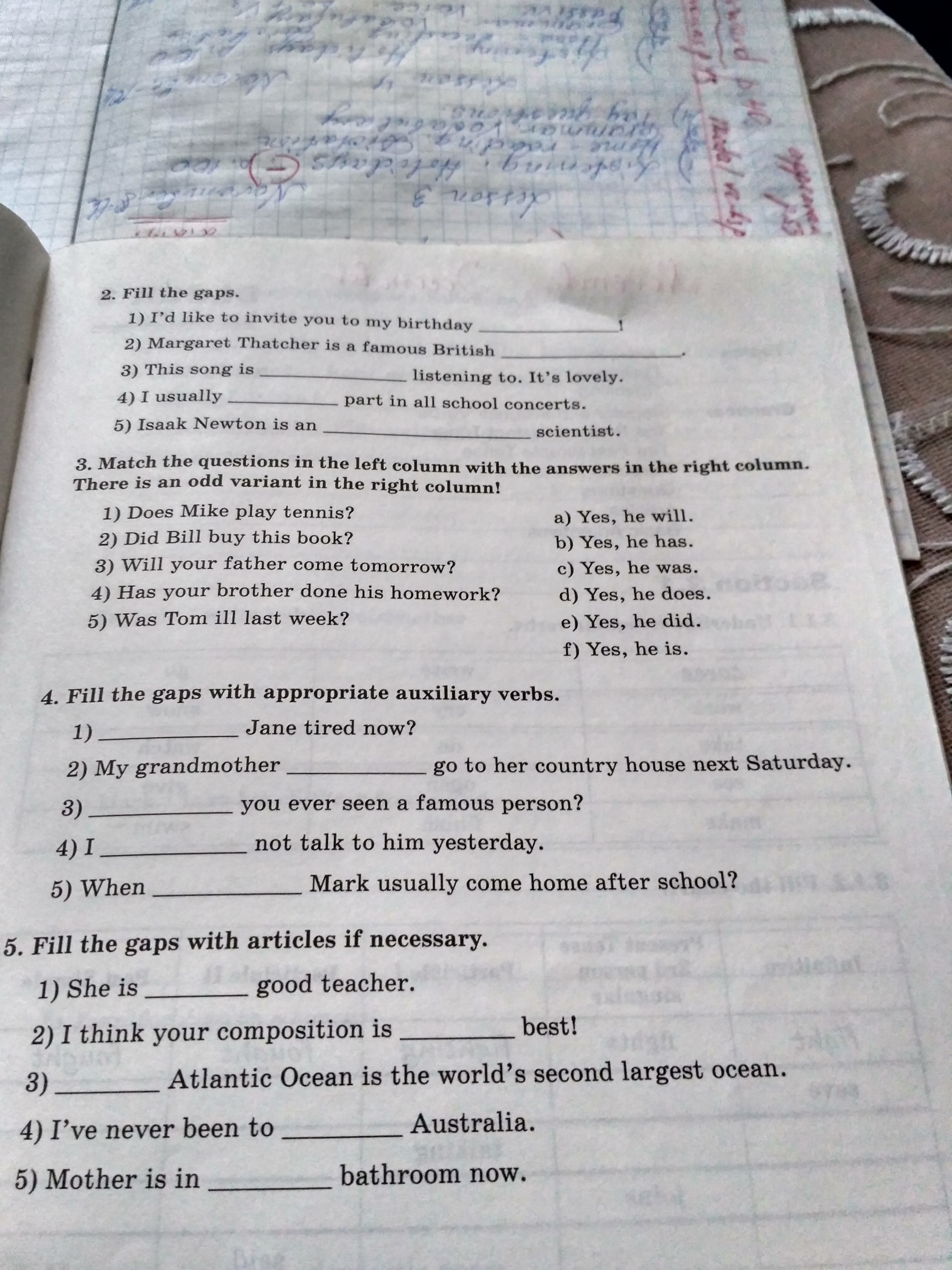 2.1)tomorrow2)politician3)pleasant4)take5)English3.1)1-d, 2-e, 3-a, 4-b, 5-c4.1)is2)will3)have4)did5)does5.1)a2)the3)The4)-5)the