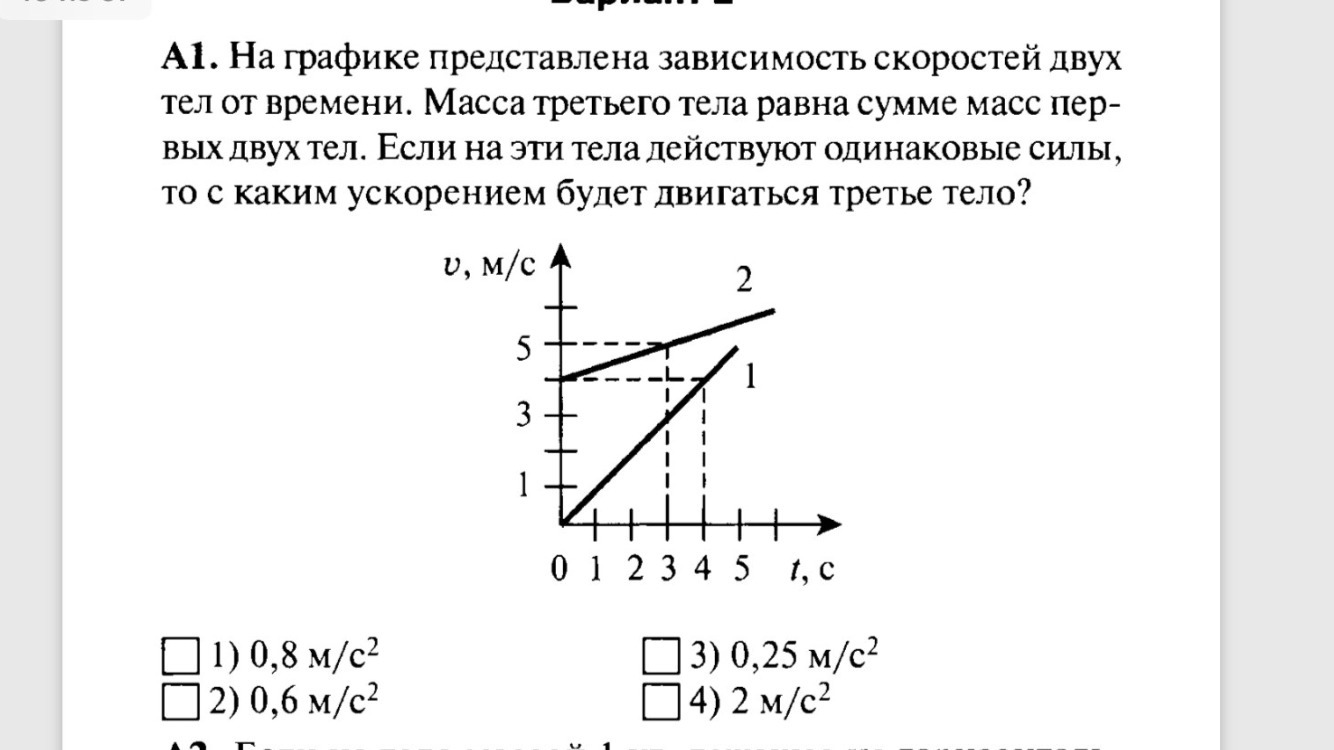 На графике представлена зависимость скоростей 2-х тел от времени. Масса третьего тела равна сумме масс первых 2-х тел . Если на эти тела действуют одинаковые силы, то с каким ускорением будет двигаться 3-е тело?