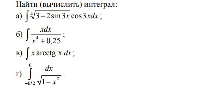 а)![\ intsqrt[4]{3-2sin{(3x)}}*cos{(3x)}mathrm{d}x={1over3}intsqrt[4]{3-2sin{(3x)}}*cos{(3x)}mathrm{d}(3x)=begin{vmatrix} u=3-2sin{(3x)}\ du=-2cos{(3x)}d(3x) end{vmatrix}= -{1over6}intsqrt[4]{u}du=-{1over6}*{4u^{5over4}over5}+C=-{2over15}sqrt[4]{(3-2sin{(3x)})^5}+C \ intsqrt[4]{3-2sin{(3x)}}*cos{(3x)}mathrm{d}x={1over3}intsqrt[4]{3-2sin{(3x)}}*cos{(3x)}mathrm{d}(3x)=begin{vmatrix} u=3-2sin{(3x)}\ du=-2cos{(3x)}d(3x) end{vmatrix}= -{1over6}intsqrt[4]{u}du=-{1over6}*{4u^{5over4}over5}+C=-{2over15}sqrt[4]{(3-2sin{(3x)})^5}+C](https://tex.z-dn.net/?f=%5C+intsqrt%5B4%5D%7B3-2sin%7B%283x%29%7D%7D%2Acos%7B%283x%29%7Dmathrm%7Bd%7Dx%3D%7B1over3%7Dintsqrt%5B4%5D%7B3-2sin%7B%283x%29%7D%7D%2Acos%7B%283x%29%7Dmathrm%7Bd%7D%283x%29%3Dbegin%7Bvmatrix%7D+u%3D3-2sin%7B%283x%29%7D%5C+du%3D-2cos%7B%283x%29%7Dd%283x%29+end%7Bvmatrix%7D%3D+-%7B1over6%7Dintsqrt%5B4%5D%7Bu%7Ddu%3D-%7B1over6%7D%2A%7B4u%5E%7B5over4%7Dover5%7D%2BC%3D-%7B2over15%7Dsqrt%5B4%5D%7B%283-2sin%7B%283x%29%7D%29%5E5%7D%2BC)