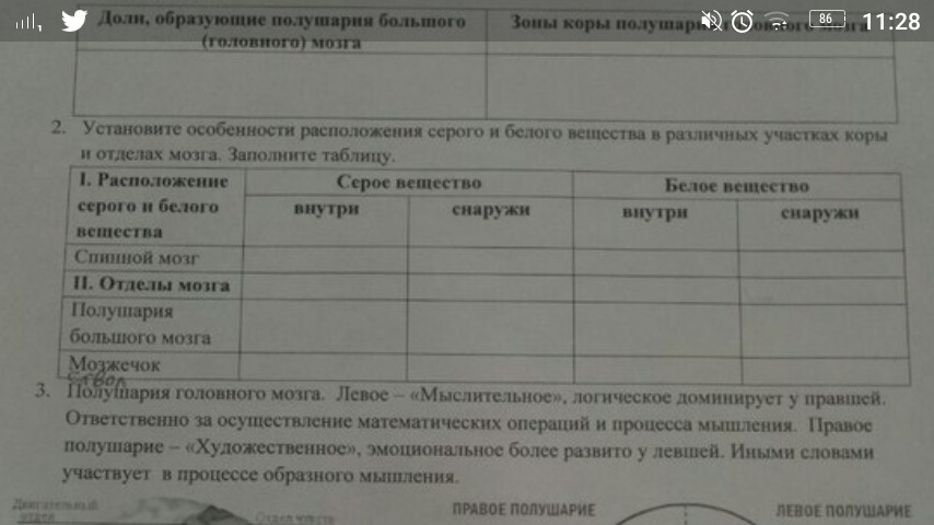 2.Установите особенности расположения белого и серого вещества в различных участках коры и отделах мозга. Заполните таблицу.
