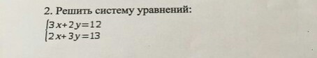 2x=13-3y. подставляем в 1 уравнение: 1,5*(13-3y)+2y=12; 19,5-4,5y+2y=12; -4,5y+2y=12-19,5; -2,5y= -7,5; y=(-7,5)/(-2,5)=3. 2x=13-3*3=13-9=4. 2x=4, x=2. Ответ: (2:3).