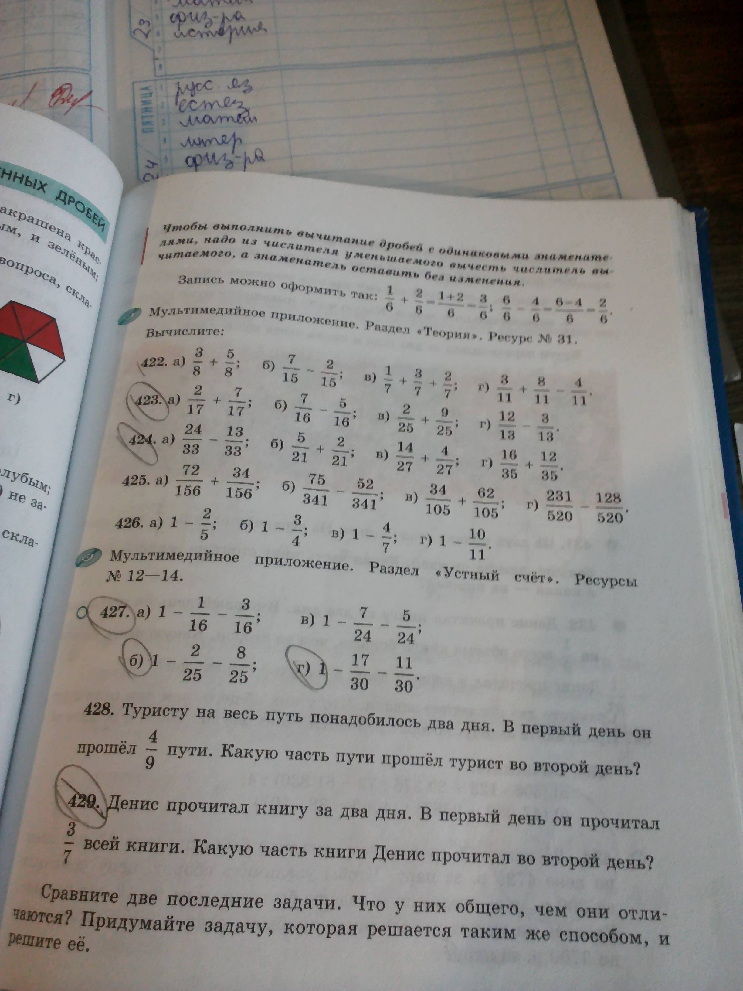 1) 7/7 - 3/7 = 4/7 -Денис прочитал во второй день
