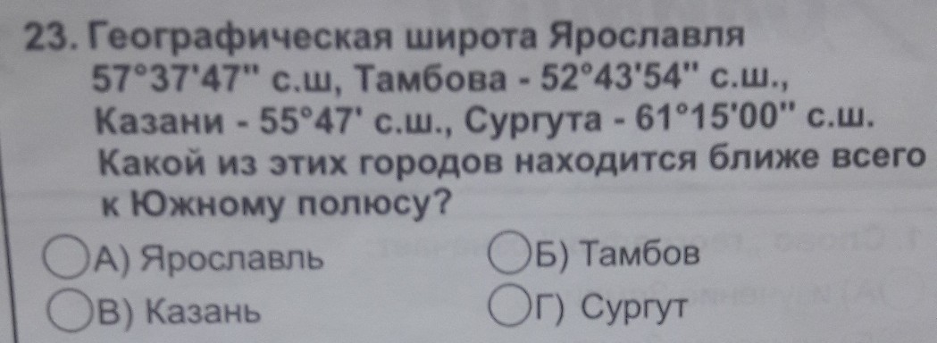 Тамбов. Т.к он ближе всех находится к экватору, а значит и к Южному полюсу