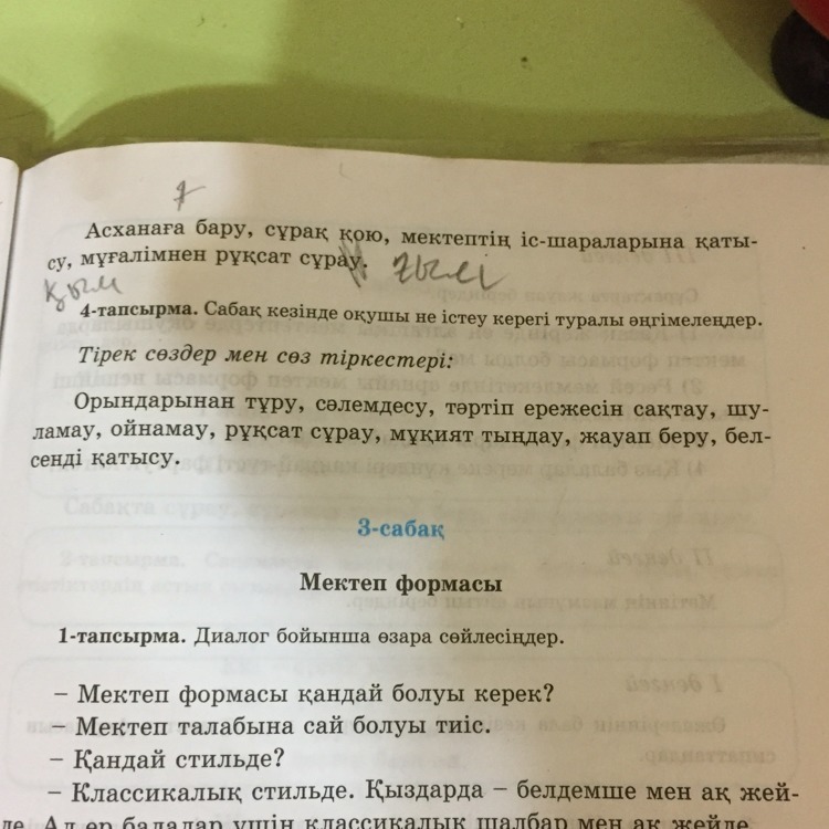 Ең алдымен мұғалім келгенде сəлемдесу керек содан соң орынынан тұру керек .Мұғалімнің сөзін тыңдау шарт .Оны мұқият тыңдау керек. Мұғалімнен рұқсат сұрап сөйлеу керек . Оның сұрақтарына жауап беру .Сабағына белсенді қатысып отыру.