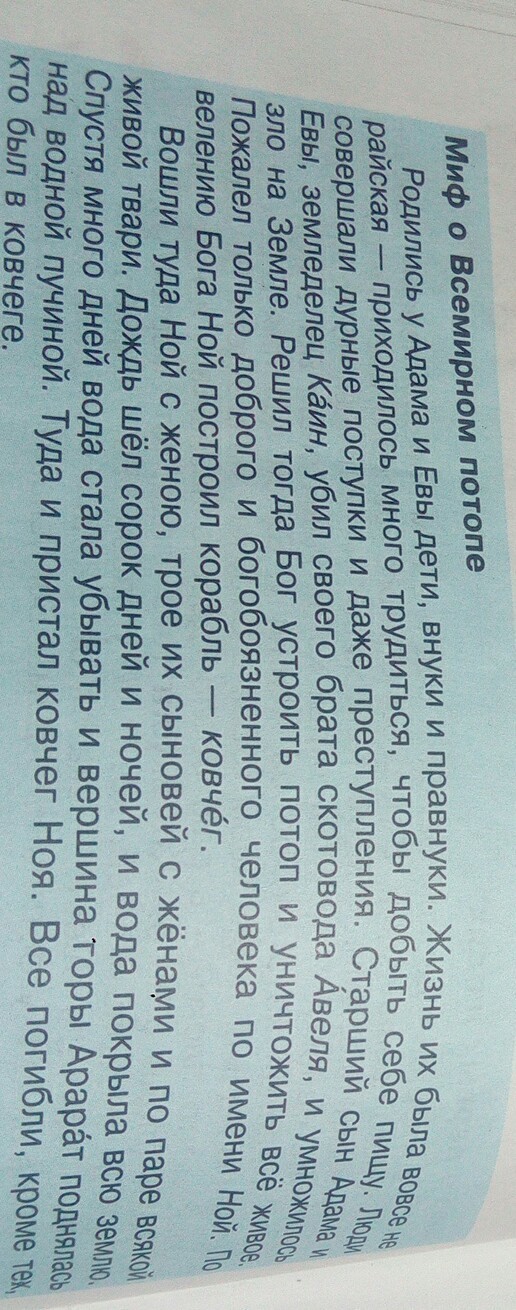 Мифы и сказания о потопе, существующие у разных народов Библия не единственный источник, повествующий о потопе, погубившем человечество. Практически у всех народов есть письменные свидетельства или устные сказания о произошедшей катастрофе. Причем большинство из них имеет сходные черты. В мифах о потопе высшие силы предупреждают праведника о предстоящем наводнении и велят строить корабль; всегда спасаются мужчина и женщина, способные продолжить род; на корабль обязательно берутся животные, которые впоследствии заселяют землю; о прекращении потопа люди узнают от выпущенных птиц. Кроме того, в большинстве легенд есть упоминание о радуге, появившейся на небосклоне при отступлении воды. Легенд, посвященных всемирному наводнению, наберется не на один том. Но в нашей книге мы вспомним только самые известные, возникшие как в до-, так и послебиблейские времена.