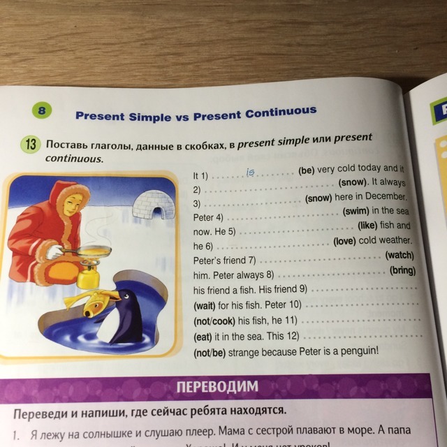 2) is snowing 3) snows 4. Is swimming 5. Like 6. Loves 7. Watches 8. Brings 9. Waits 10. Doesn’t cook 11) eats 12) is not