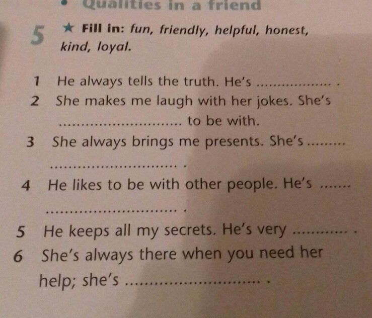 1. honest 2.fun 3.kind 4.friendly 5.loyal 6.helpful