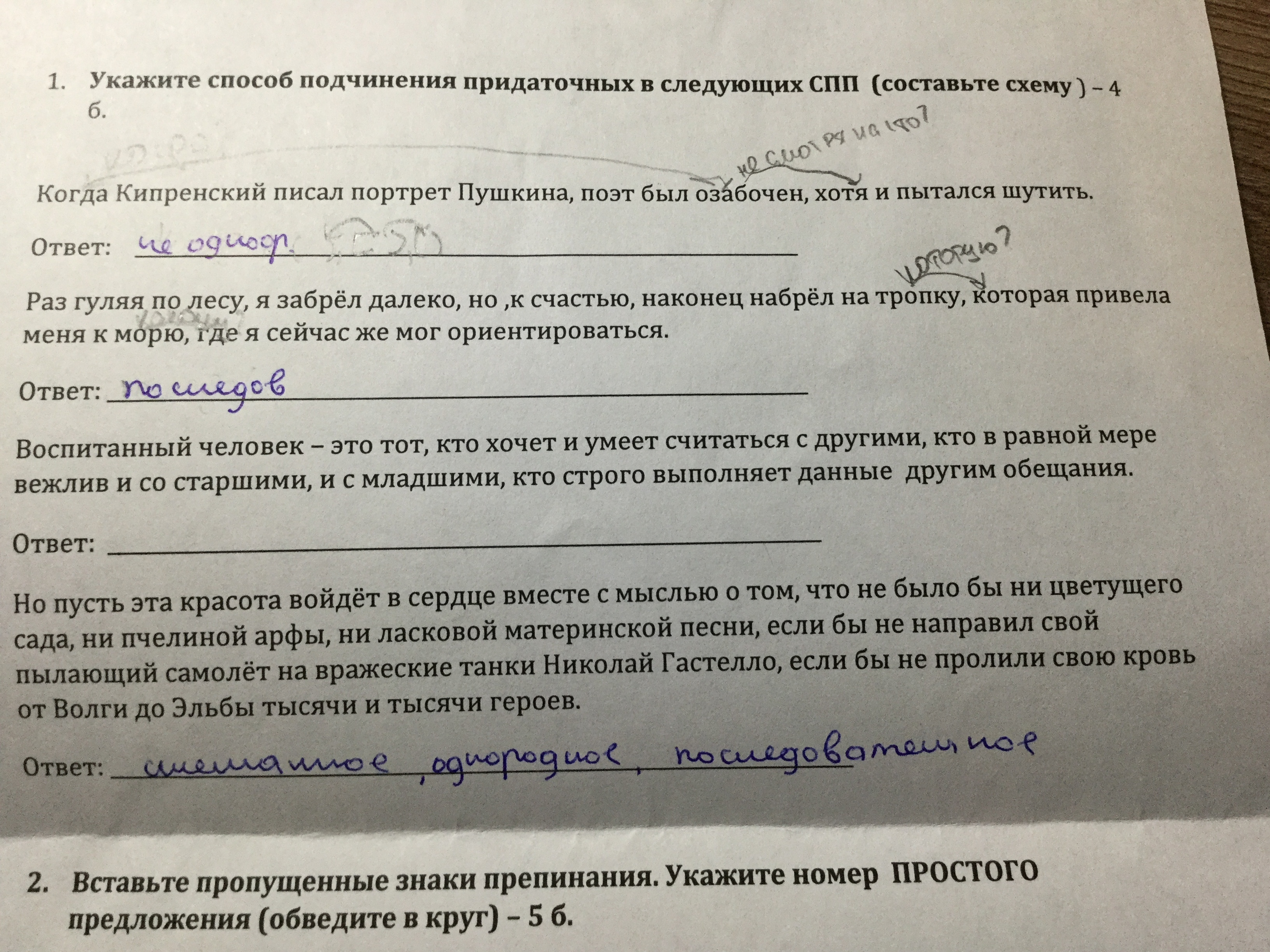Ответы правильные на листочке, кроме З-го. Это однородное подчинение.