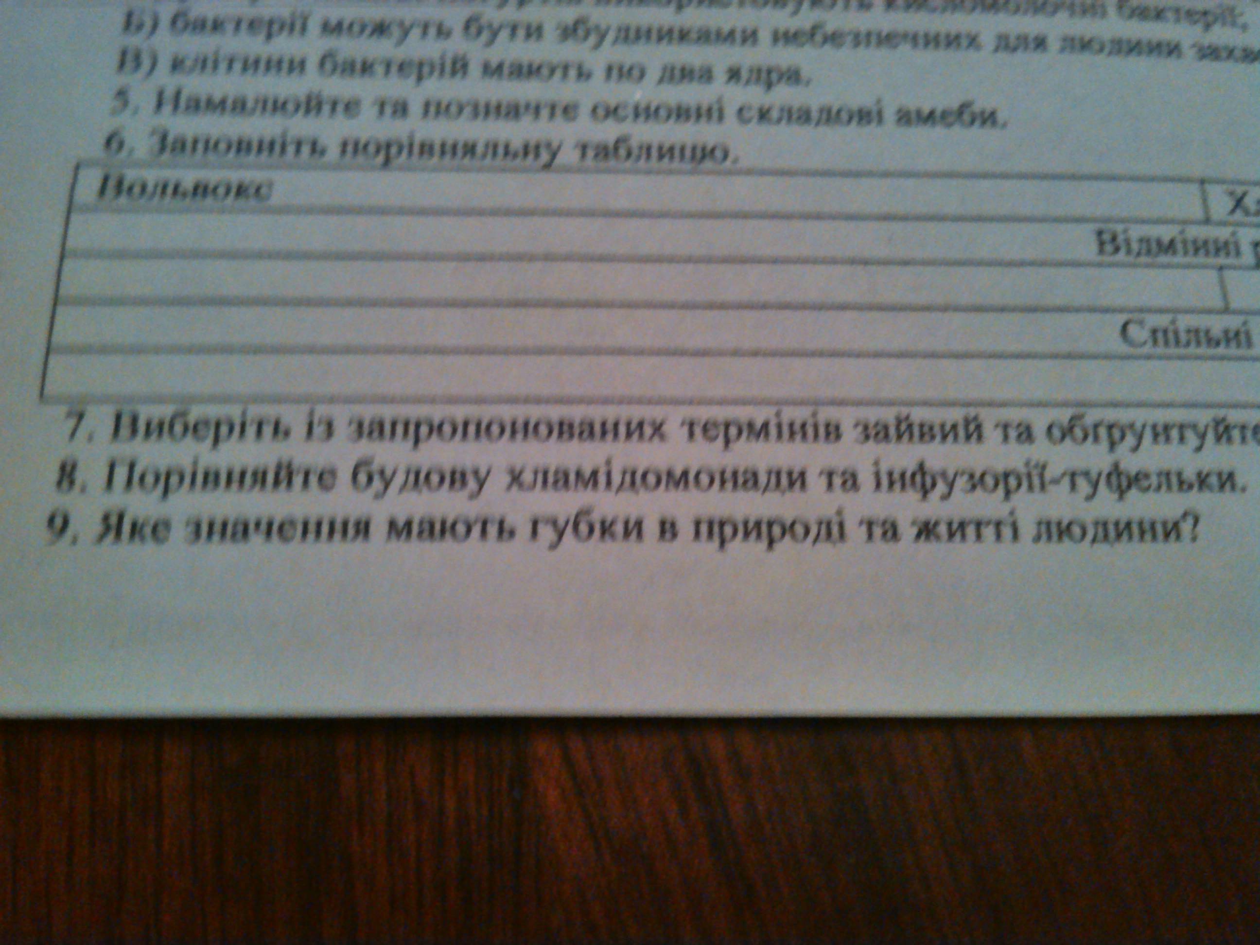 Хламідомонада має 1 велике ядро, в інфузорії-туфельки їх 2(мале і велике).І хламідомонада і інфузорія мають 2 скоротливі вакуолі,які виводять зайду воду з організму. В інфузорії є клітинний рот., порошиця(особливий утвір,через який викидаються неперетравлені рештки). Хламідомонада пересувається завдяки 2 джгутикам, в інфузорії все поверхня вкрита великою кількістю війок. У хламідомонади є червона пляма-вічко та хлоропласт,тобто на відміну від інфузорії хламідомонада фотосинтезує.