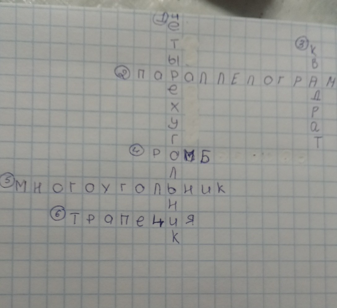 1-четырехугольник. 2-параллелограмм.3-квадрат.4-ромб.5-многоугольник.6-трапеция.