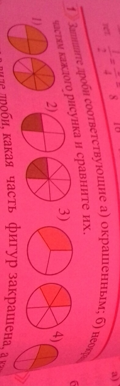 Запишите дроби соответствующие а)окррашенным б)неокрашенным частям каждого рисунка и сравните их .