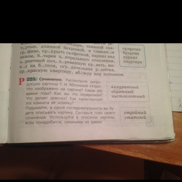 Посреди комнаты изображена высокая стройная девочка с косичкой, в белой майке и темных шортах. Она делает утреннюю зарядку перед тем, как пойти в школу. Видно, что девочка часто занимается и обладает хорошей пластикой.