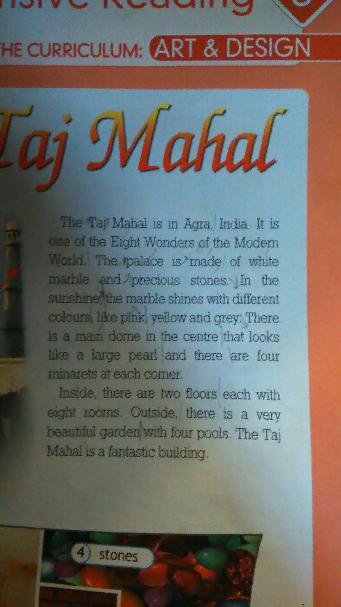 Тадж-Махал находится в Агре, Индия. Это одно из восьми чудес современного мира. Дворец выполнен из белого мрамора и драгоценных камней: в мраморе сияет разными цветами, например, желтым и серым. В центре есть главный купол, который выглядит как большая жемчужина, и в каждом углу есть четыре минарета. Внутри, там два этажа с восемью комнатами. Снаружи есть очень красивый сад с четырьмя бассейнами. Тадж-Махал - фантастическое здание