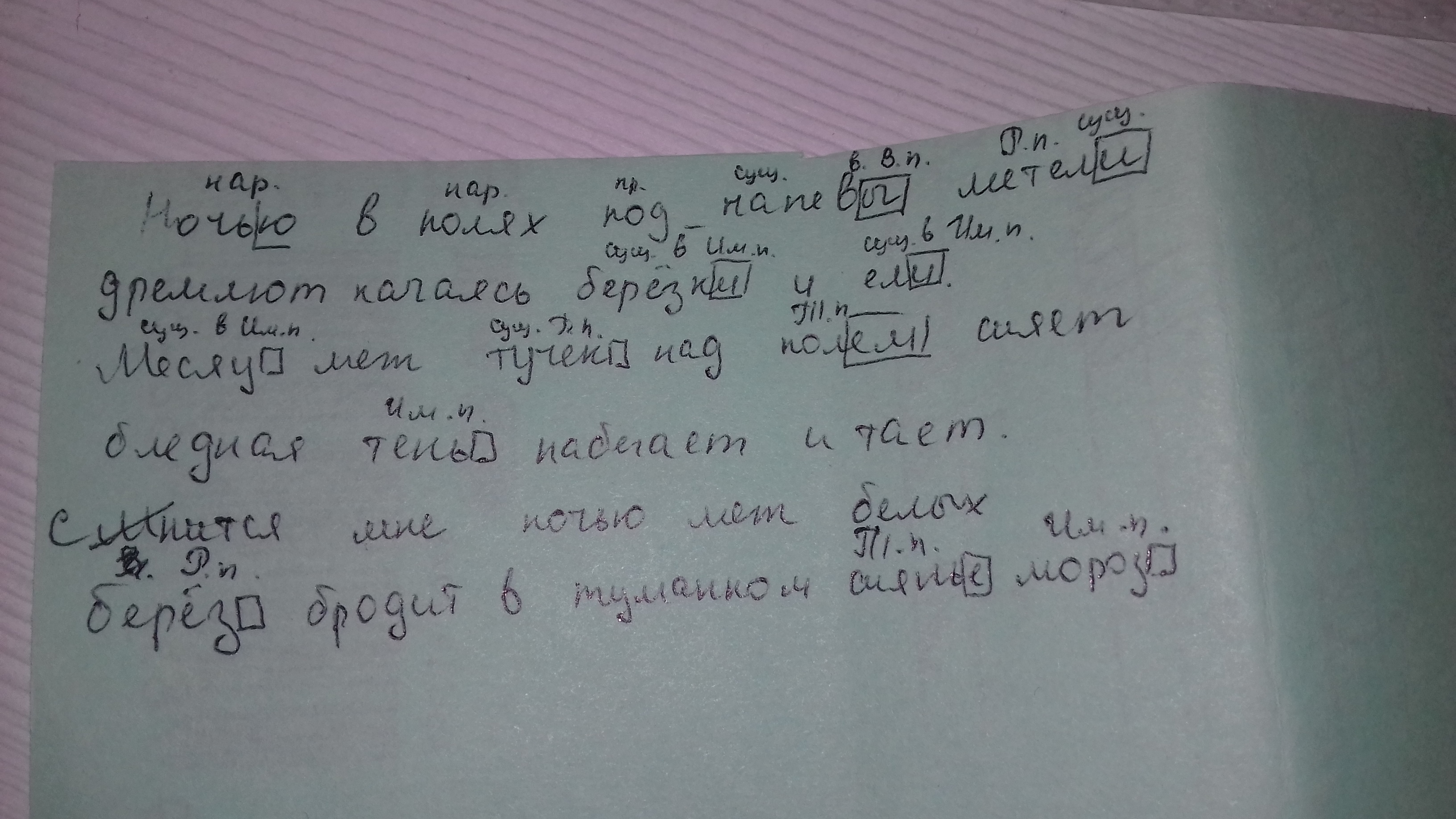 Выдели окончание сущ. Запиши их падеж. Ночью в полях под напевы метели дремлют качаясь березки и ели.месяц меж тучек над полем сияет бледная тень набегает и тает. Мнится мне ночью меж белых берез бролит в туманном сиянье мороз