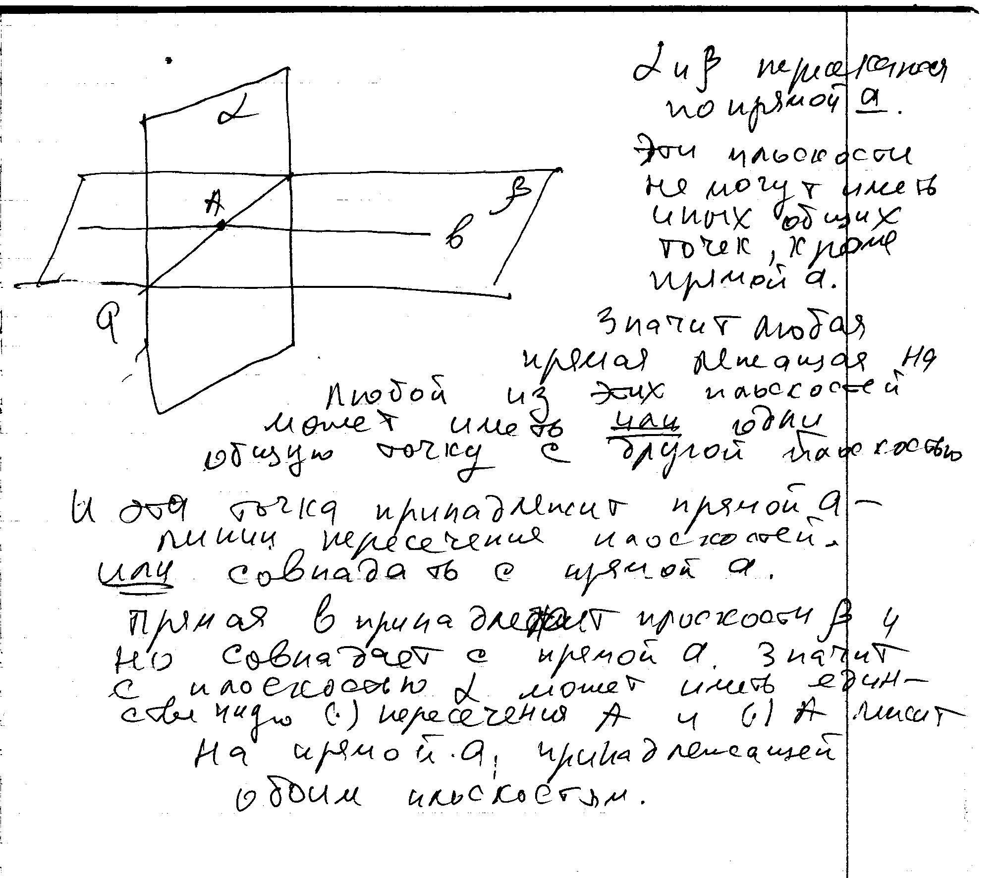 Плоскости альфа и бета пересекаются по одной прямой а. Прямая b лежащая в плоскости бета, пересекает плоскость альфа в точке А. Где лежит точка А?