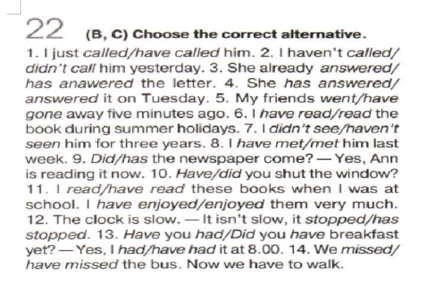 1. I just called/have called him. 2. I haven’t called/ didn’t call him yesterday. 3. She already answered/ has answered the letter. 4. She has answered/ answered it on Tuesday. 5. My friends went/have gone away five minutes ago. 6. I have read/read the book during summer holidays. 7. I didn’t see/haven’t seenhim for three years. 8. I have met/met him last week. 9. Did/has the newspaper come? – Yes, Ann is reading it now. 10. Have/did you shutthe window? 11. I read/have read these books when I was at school. I have enjoyed/enjoyed them very much.
