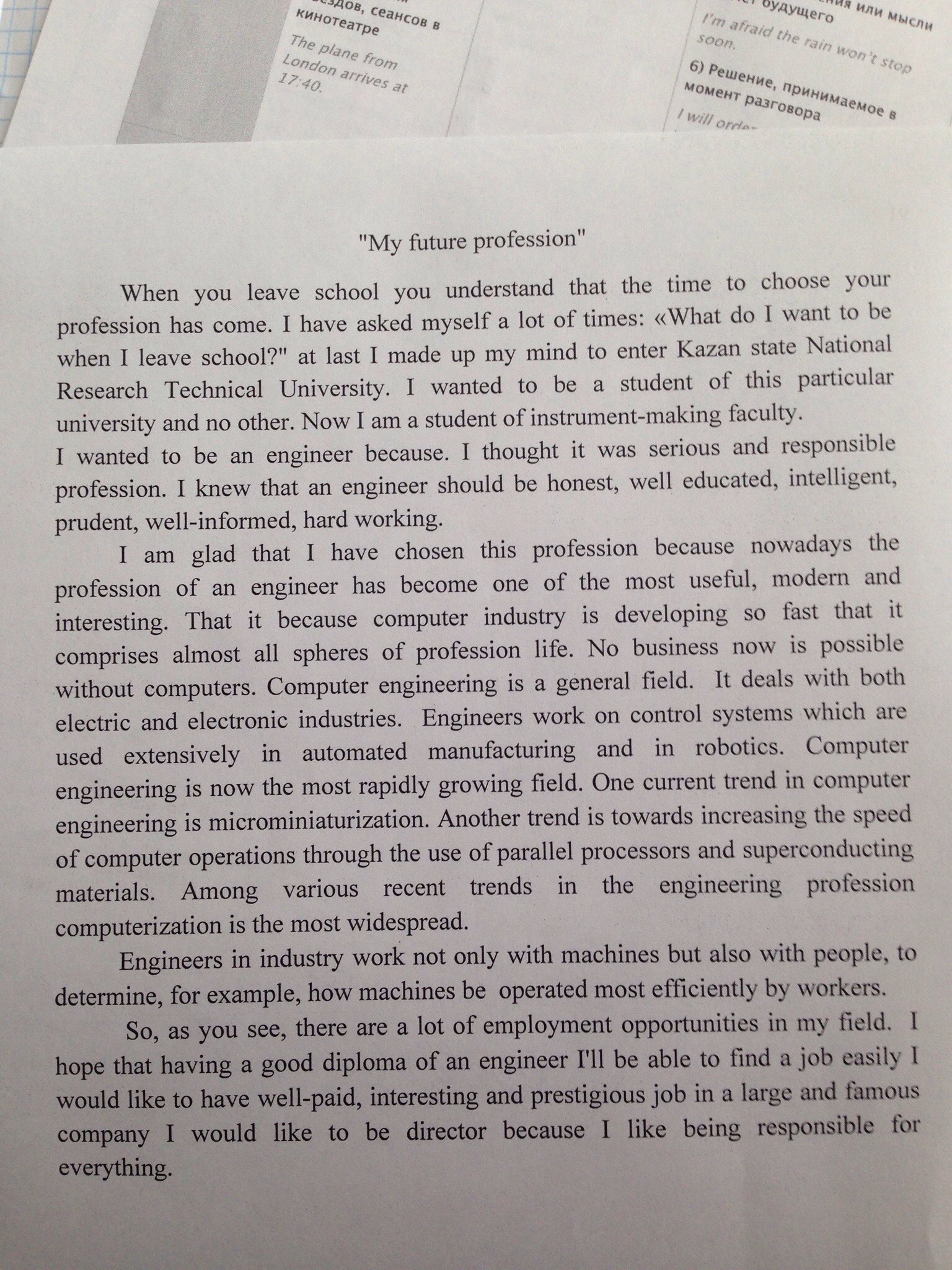 Так что, как видите, в моей сфере много возможностей для трудоустройства. Надеюсь, что с хорошим дипломом инженера в руках, я смогу легко найти интересную, престижную работу в крупной и популярной компании, где будут хорошо платить. Я бы хотел быть в ней директором потому, что я люблю быть ответственным за всё.