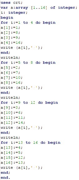 uses crt;var a:array [1..16] of integer;i: integer;beginfor i:=1 to 4 do begina[1]:=1;a[2]:=8;a[3]:=9;a[4]:=16;write (a[i],' ');end;writeln;for i:=5 to 8 do begina[5]:=2;a[6]:=7;a[7]:=10;a[8]:=16;write (a[i],' ');end;writeln;for i:=9 to 12 do begina[9]:=3;a[10]:=6;a[11]:=11;a[12]:=14;write (a[i],' ');end;writeln;for i:=13 to 16 do begina[13]:=4;a[14]:=5;a[15]:=12;a[16]:=13;write (a[i],' ');end;end.