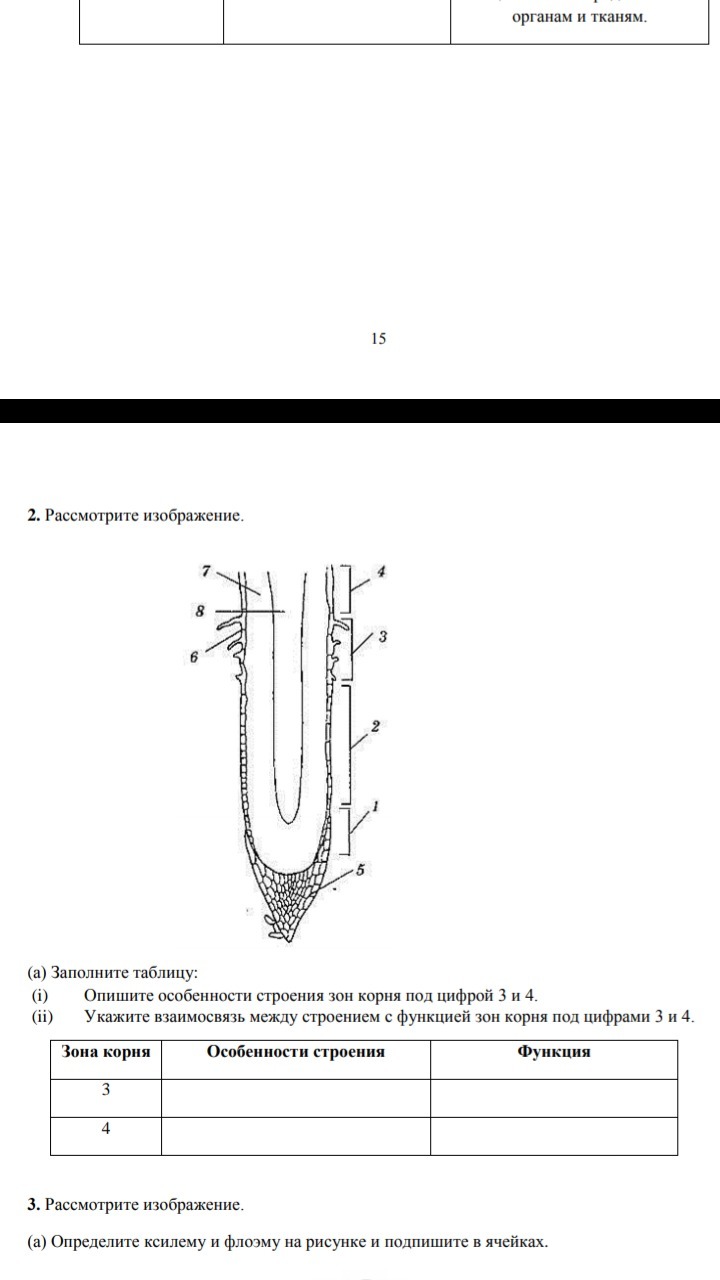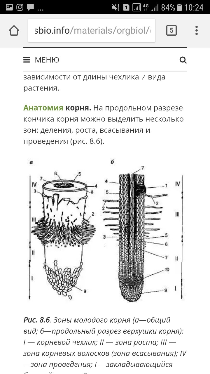 Зоны молодого корня (а—общий вид; б—продольный разрез верхушки корня): I — корневой чехлик; II — зона роста; III — зона корневых волосков (зона всасывания); IV—зона проведения; I —закладывающийся боковой корень; 2 — корневые волоски на эпиблеме; 3 -— эпиблема; 4 — экзодерма; 5 — первичная кора; б — эндодерма; 7 — перицикл; 8 — осевой цилиндр; 9 — клетки корневого чехлика; 10 — апикальная меристема.