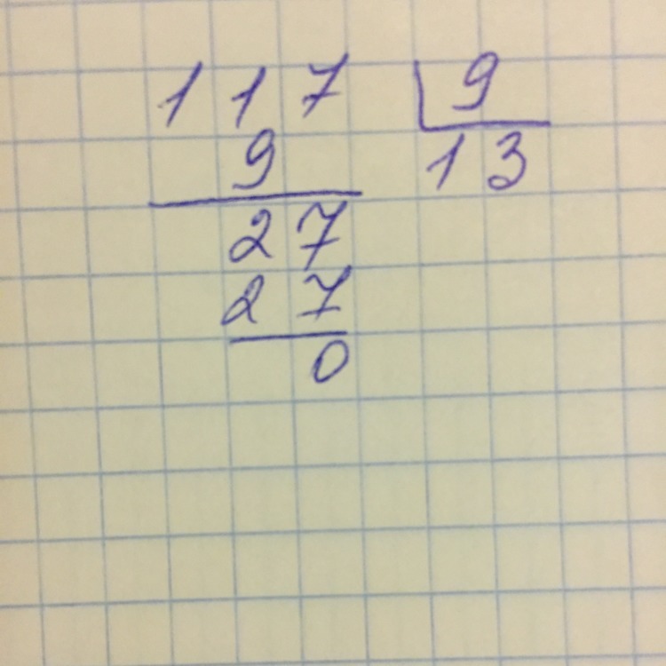 Выпооолни деление столбиком числа 117 на число9, используя данные случай диления с остатком. 11÷9=1( ост2) 27÷9=3(ост0)