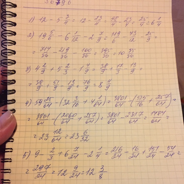 5) 9 - 2/3 + 6 целых 7/24 - 2 целых 1/4 =