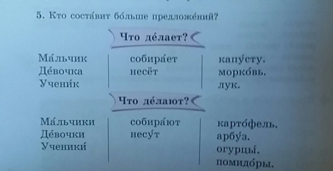 Мальчик несёт капусту . Девочка собирает лук. Девочка несёт морковь. Мальчики собирают картофель. Девочки собирают арбузы. Ученики несут огурцы