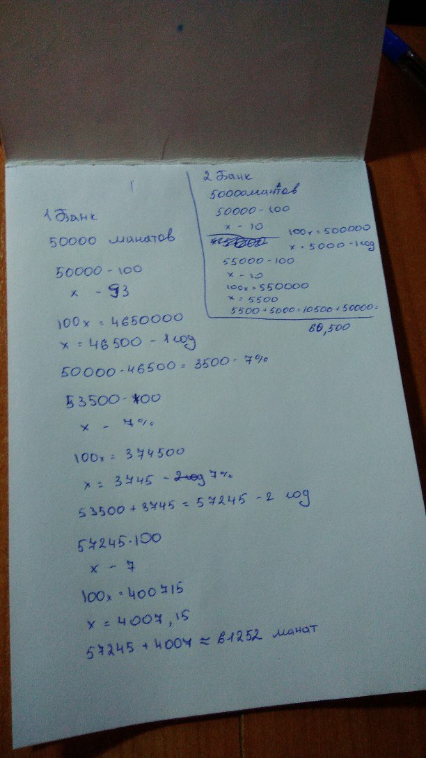 Архитектор решил гонорар в сумме 100000 манатов, полученный за проект моста, вложить в два банка.Половину этой суммы он выложил на 3 года в государственный банк с годовым процентном ростом 7% от вложенной суммы а вторую половину на 2 года в коммерческий банк с годовым процентным ростом 10% от суммы предыдущего года. Кокой банк дал больше дохода?
