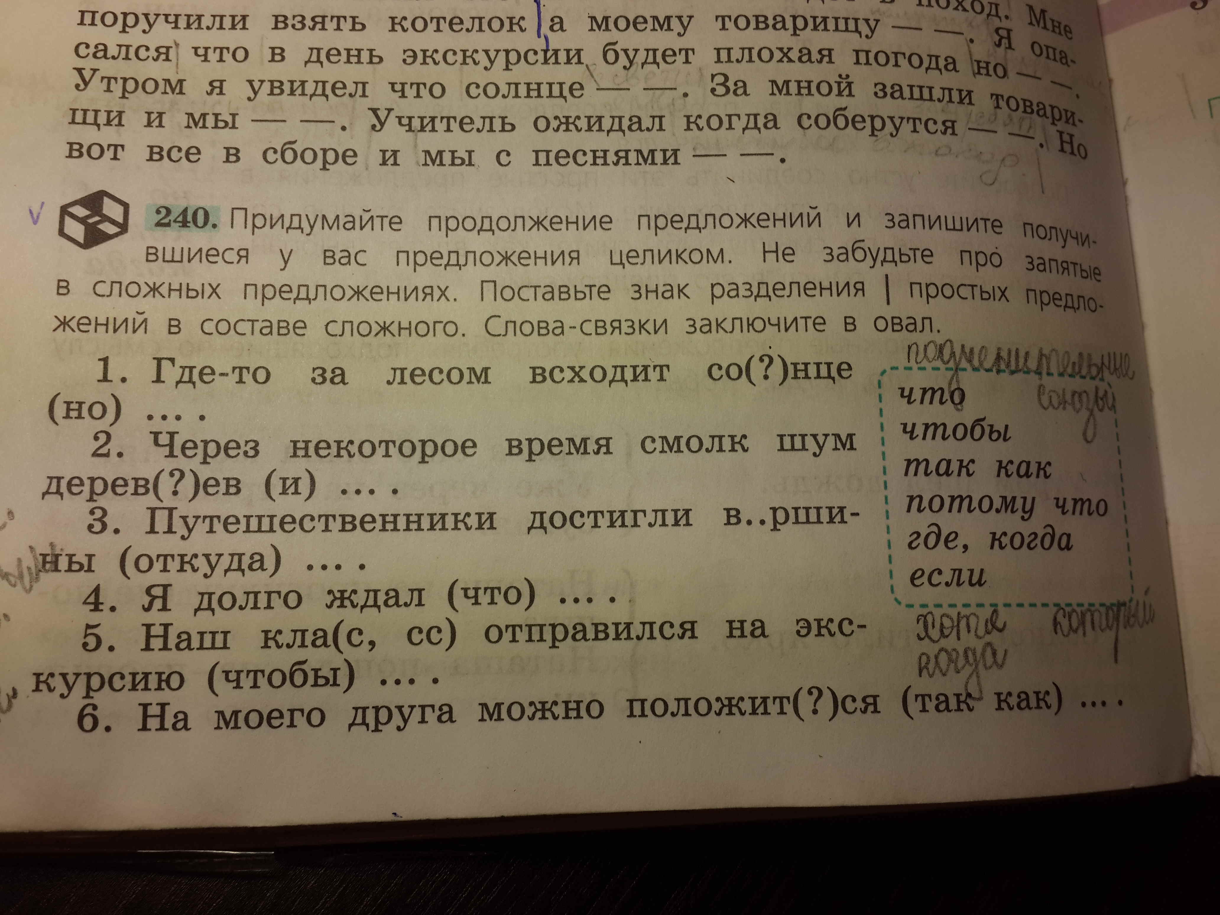 1.Где-то за лесом всходит солнце,| но его плохо видно.2.Через некоторое время смолк шум деревьев,| и подул лёгкий ветерок.3.Путешествинники достигли вершины,| откуда был красивый вид.Я долго ждал,| что через неделю у меня будет день рождения.4.Наш класс отправился на экскурсию,| чтобы увидеть множество прекрасных картин.5.На моего друга можно положиться,| так как он очень верный и добрый.