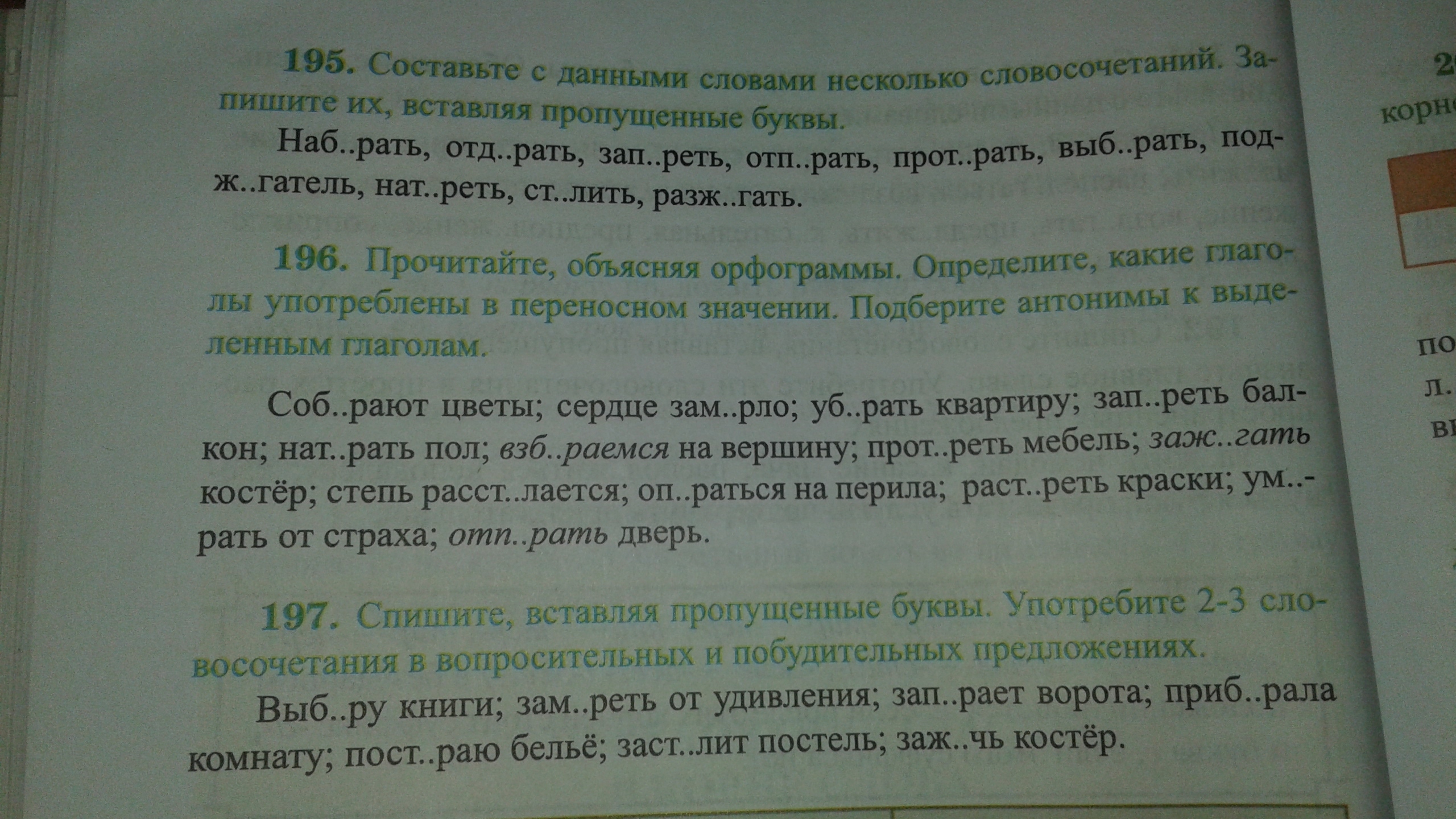 Собирают цветы; сердце замерло; убирать квартиру; запереть балкон; натирать пол; взбираемся на вершину; протереть мебель; зажигать костёр; степь расстилается; опираться на перила; растереть краски; умирать от страха; отпирать дверь.
