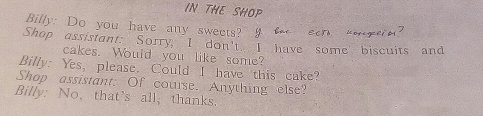 Продавец: К сожалению, нет. У нас есть немного печенья и торты. Хотите?