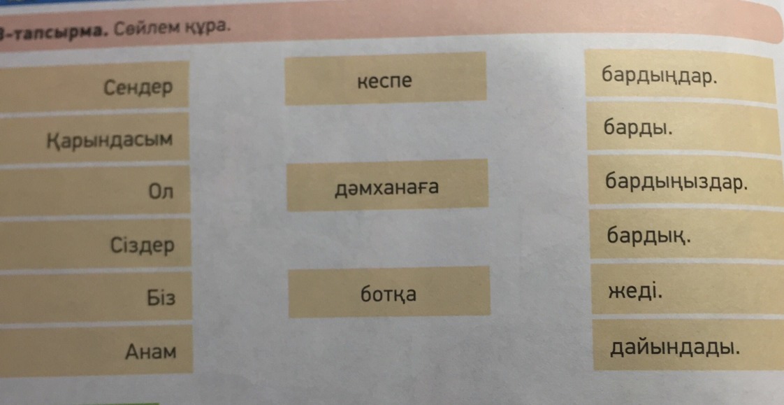 Сендер дәмханаға бардыңыздар. Қарындасым дәмханаға барды. Ол ботқа жеды. Сіздер дәмханаға бардыңдар .Біз дәмханаға бардық. Анам кеспе дайындады.