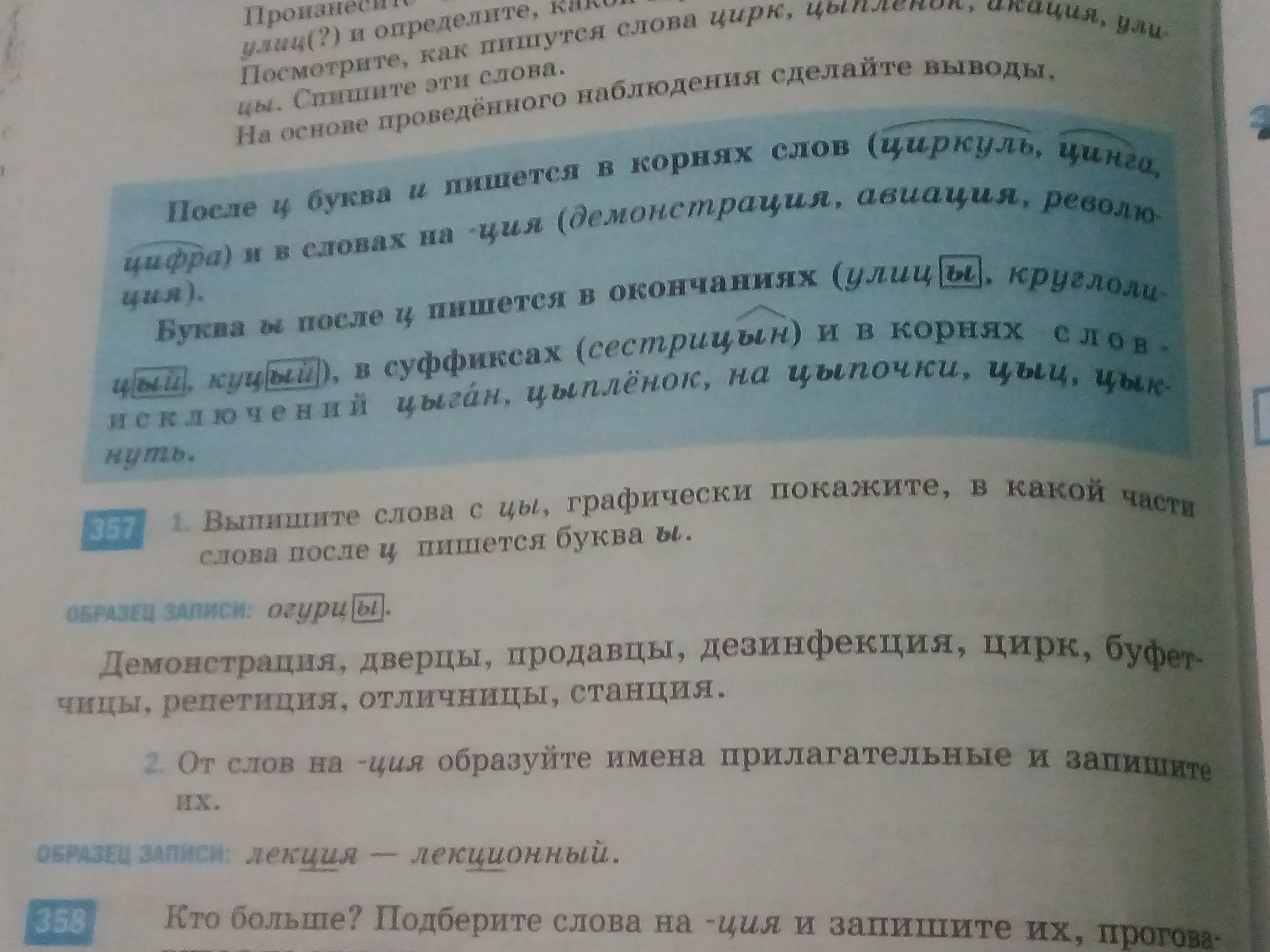 Демонстрация - демонстративный, дезинфекция - дезинфективный, цирк - цирковный, репетиция - репетиционный, станция - станичный.