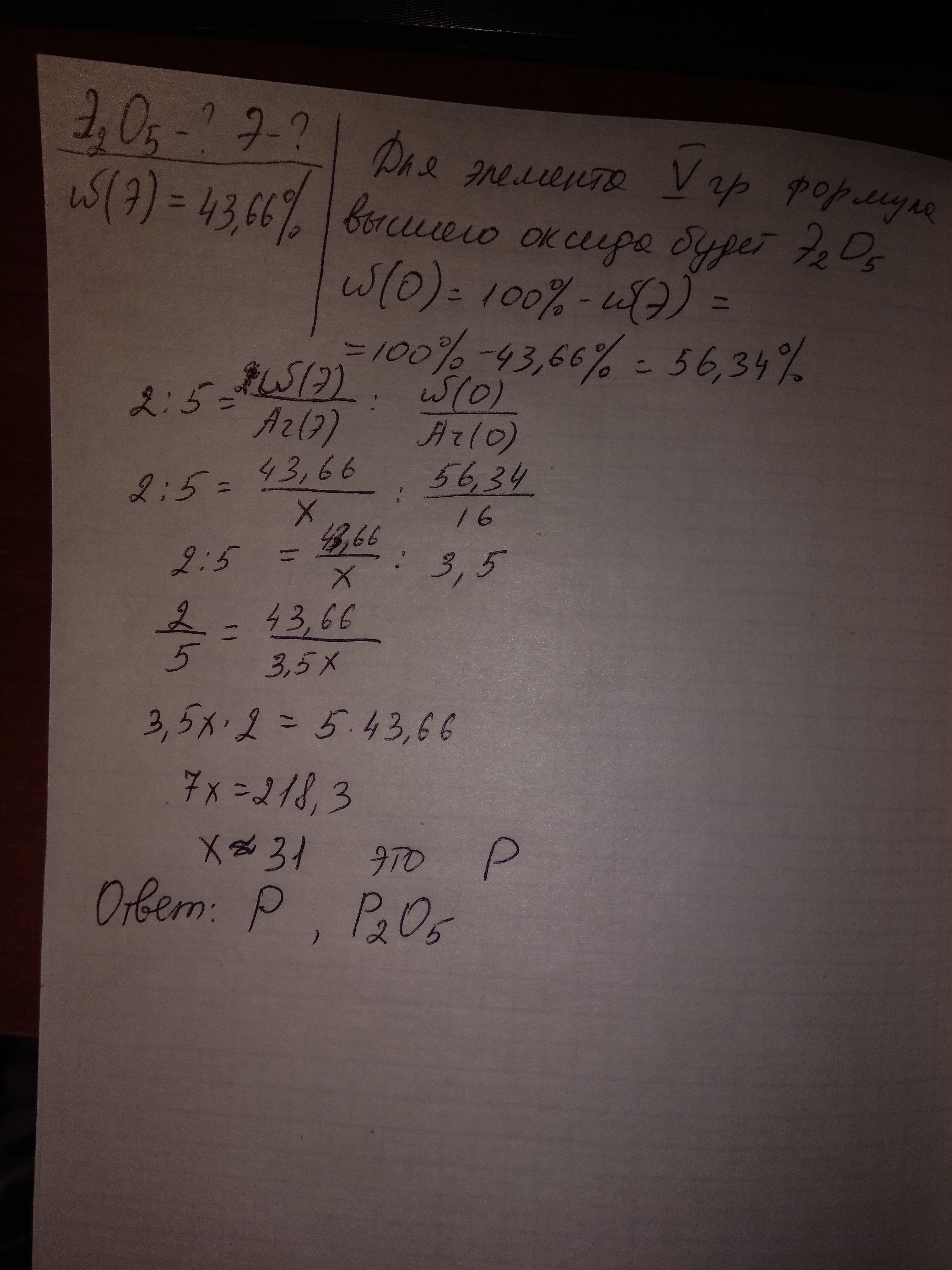 Химический элемент находится в 5 группе периодической системы Менделеева. Массовая доля элемента в его высшем оксида составляет 43,66%. Определите, какой это элемент? Желательно с пояснением и решением, чтобы понятно было.