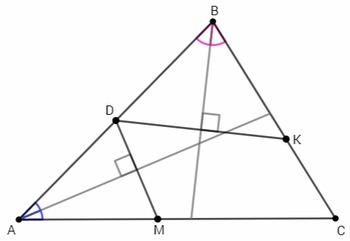 Треугольник ADM - равнобедренный, так как в нем биссектриса является высотой (по условию биссектриса угла A перпендикулярна основанию DM), AM=AD. Аналогично BK=BD. AD=BD по условию. Следовательно, AM=BK.