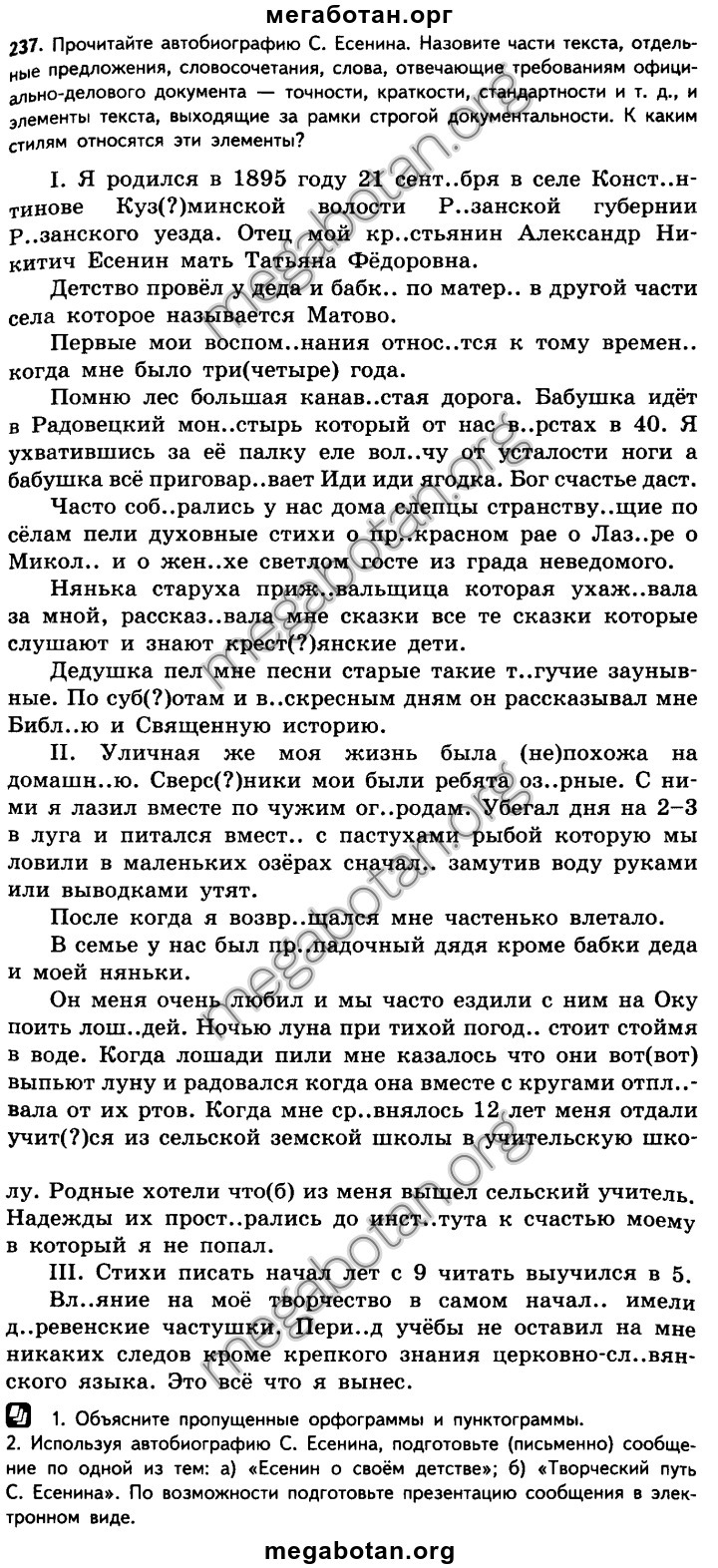 1. Я родился в 1895 году 21 сентЯбря (сентЯбрь) в селе КонстАнтинове (словарное) КузЬминской (смягчение) волости, Рязанской (словарное) губернии и РЯзанского уезда. Отец мой — крЕстьянин (словарное) Александр Никитич Есенин, мать — Татьяна Фёдоровна.