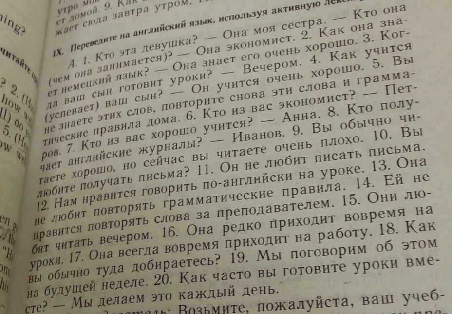 is my sister she knows who this girl is? She's like 3. She's very good. learns She knows him How does 5. uev ona language? very good r prepares He learns grammy-ssh these layers and TIet your son repeat again 8. Who do the floor of these words, for you Anna chi 6. do not know Avila at home. you usually learn You 7 Which of you is good Ivanov 9. 10. The ditch, the journals you are She 13. You read very badly. letters. but now he likes to write well, 11. He does not learn. ratm n in English on She does not like to receive the rules 14. loves to repeat grammatical 15. They are on time We like not words for comes 18. Like to repeat She rarely works. read in the evening, 16 at this lesson. 17, She always arrives on time in time. 19. We'll talk You usually go there and prepare lessons for next week. 20. How often is cre? We do it every day