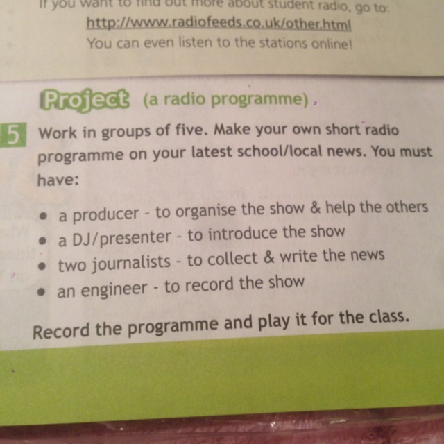 работайте в групе из 5 человек 1 продюсэр для организации и помощи другим . 1 диджэй для видения прогкамы . 2 журналиста для сбора информации . инжинер для запвиси шоу . радио шоу о последниъх новостях в школе или городе