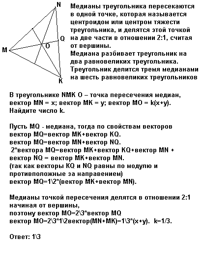 1. В треугольнике NMK О – точка пересечения медиан, MN = x; MK = y; MO = k(x+y). Найдите число k.