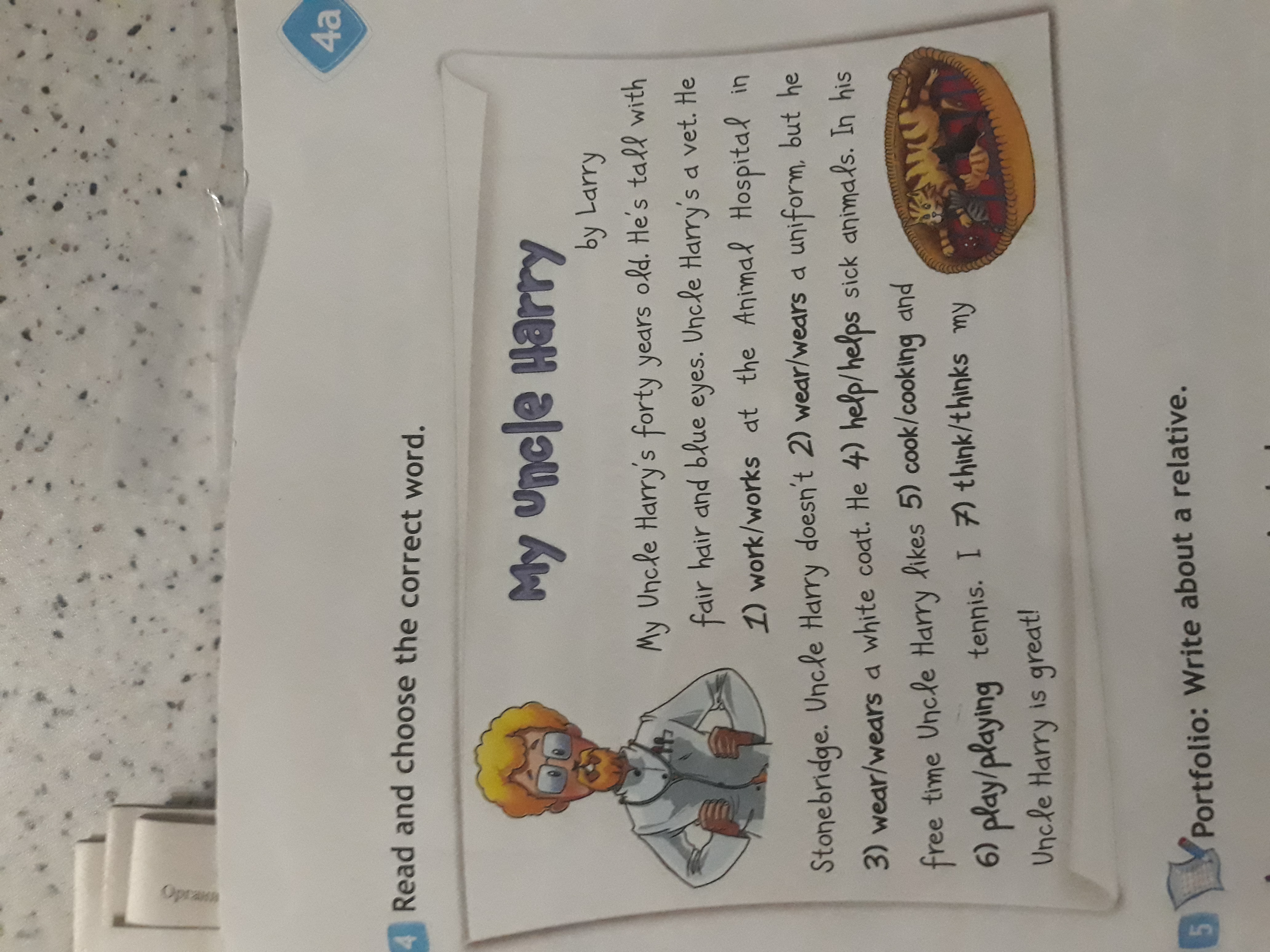 Моему дяде Гарри 40 лет.Он высокий,светловолосый с голубыми глазами.Дядя Гарри — ветеринар.Он работает в ветеринарной лечебнице ,в Стоунбридже.Дядя Гарри не носит форму,но он носит белый халат.Он помогает больным животным.В свободное время он любит готовить и играть в теннис.Я думаю, мой дядя Гарри— классный!