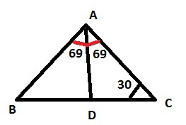 В треугольнике ABC. AD-биссектриса, угол C равен 30 градусо, угол BAD равен 69 градусов. Найдите угол ADB.